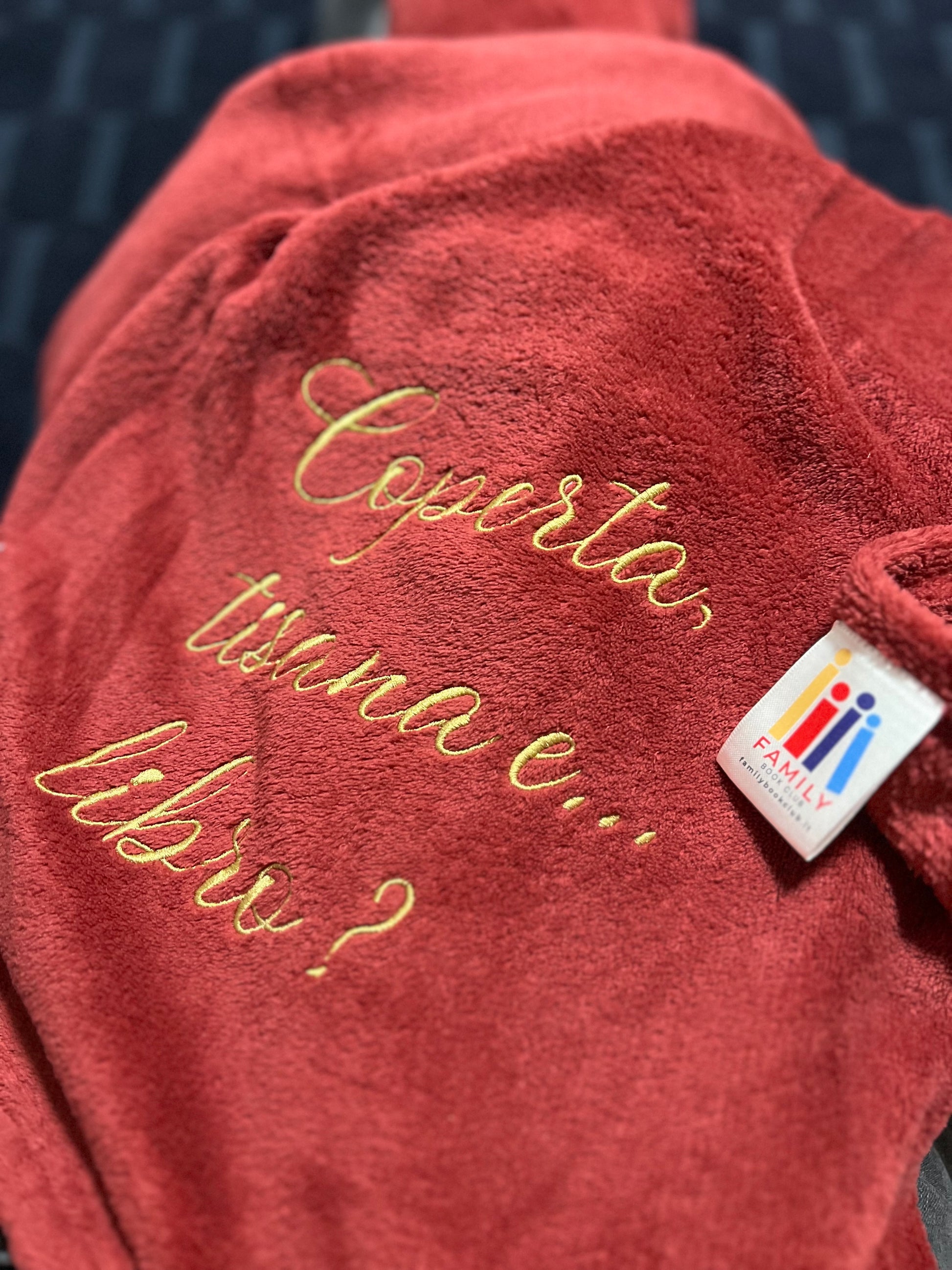 Coperta in pile matrimoniale con la scritta ricucita: “Coperta, tisana e.. libro?” e con il logo del Familybookclub.it